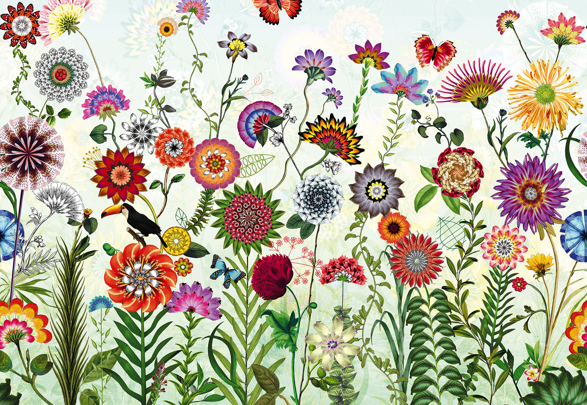 Die Blumen und Blüten der 3D Fototapete bringen Farbe und Fröhlichkeit ins Zuhause – und offenbaren erst bei genauerem Hinsehen ihre geometrischen Strukturen.