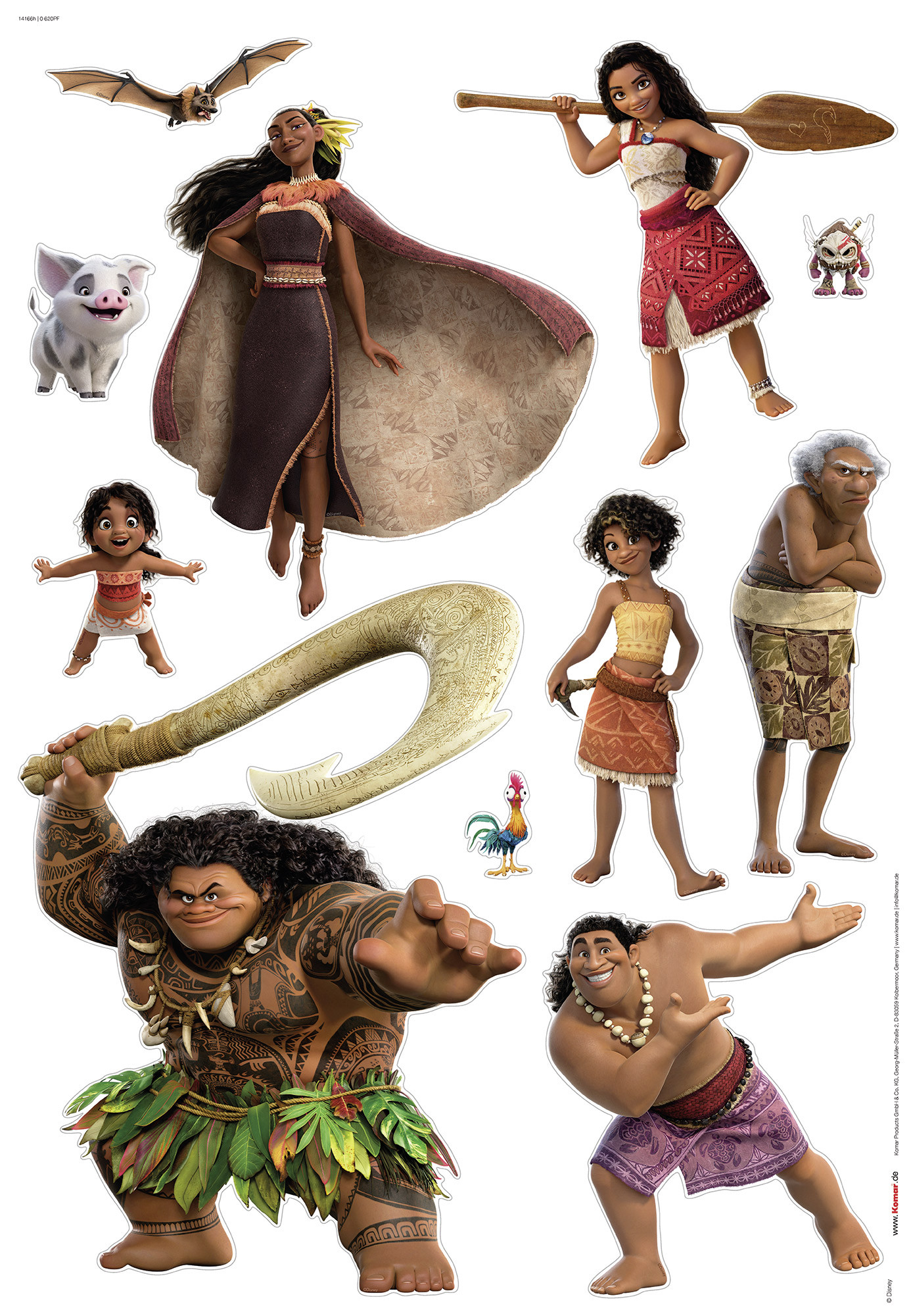 Der Stickerbogen zeigt Charaktere aus Disneys Vaiana. Abgebildet sind Vaiana in verschiedenen Posen, Maui mit seinem magischen Haken, Tala, Tui, Pua, Hei Hei und andere Figuren. Die Sticker vermitteln Abenteuer und Gemeinschaft mit lebendigen Farben und dynamischen Posen.