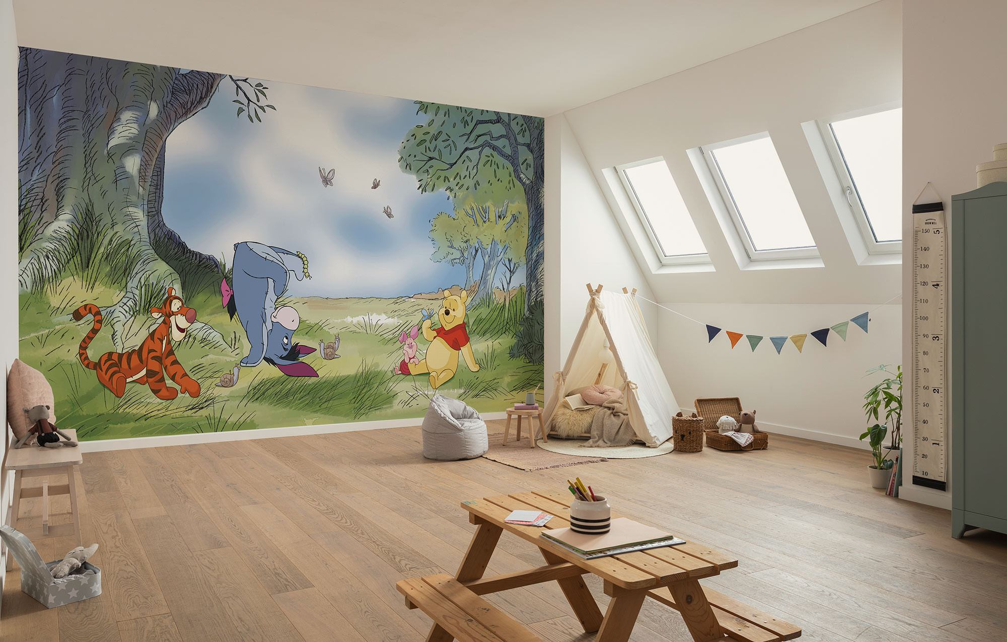 Winnie Puuh liebt Honig über alles – fast so sehr wie seine treuen Freunde. Gemeinsam mit Tigger, Ferkel und I-Ah stürzt er sich in die wundervollsten Abenteuer, die das Hundertmorgenwald-Leben zu bieten hat. Die niedliche Tapete für das Kinderzimmer setzt harmonisierende Akzente im Raum und verbreitet gute Laune in den vier Wänden.