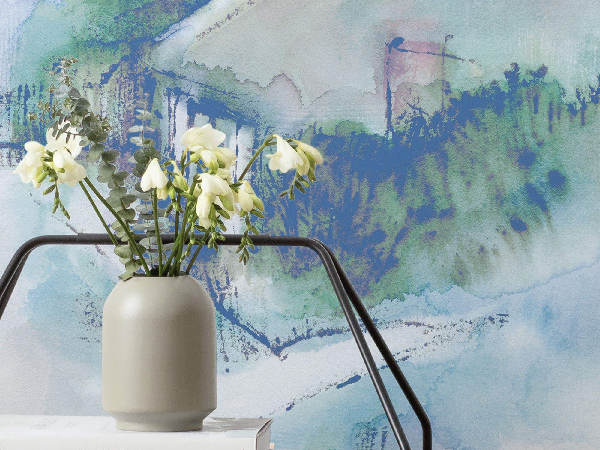 Ein von Nebel bekleideter idyllischer Ort zwischen Berglandschaften und Wäldern. Das Motiv in Aquarelloptik verwandelt das Zuhause in einen beruhigenden Erholungsort.