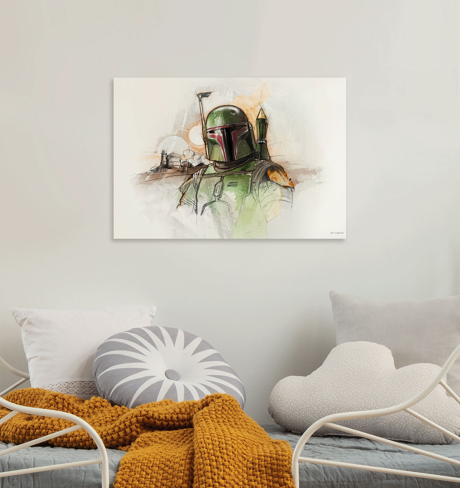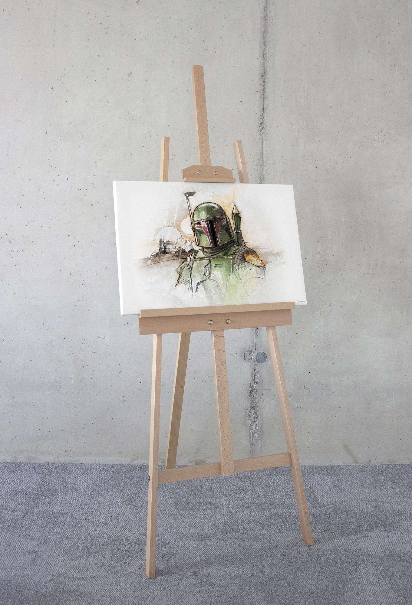 Das Wandbild stellt eine kunstvolle Skizze von Boba Fett dar, dem legendären Kopfgeldjäger aus dem Star Wars-Universum, in seiner charakteristischen grünen Rüstung mit rotem Visier. Der Hintergrund ist dezent gehalten, mit angedeuteten Landschaftselementen wie zwei Sonnen, die an Tatooine erinnern, und sanften, erdigen Farbtönen, die eine stimmungsvolle Atmosphäre schaffen.